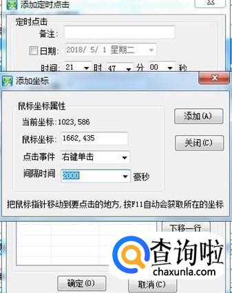 接下来的界面,“鼠标坐标”不用输入,知需把鼠标放到你要点击的地方,然后按F11,哪个位置的坐标就自动填入了。点击“点击事件”旁边的下拉箭头,点选鼠标动作,再填上间隔时间,点“添加”,再点关闭。