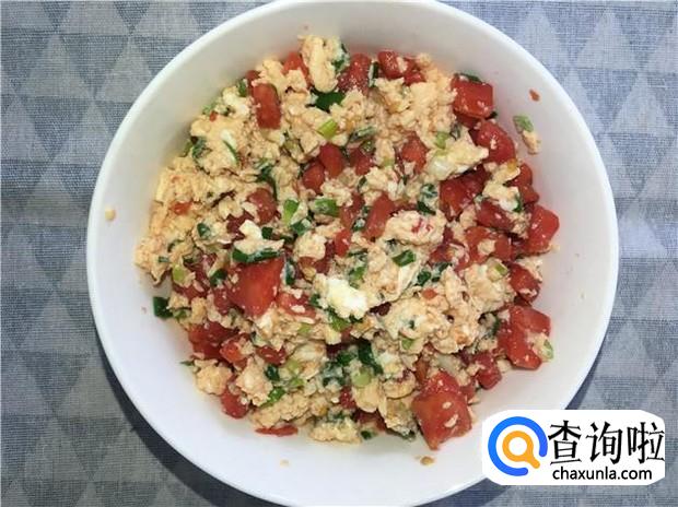 然后把番茄丁一起加到鸡蛋中,加入少许盐,搅拌均匀。
