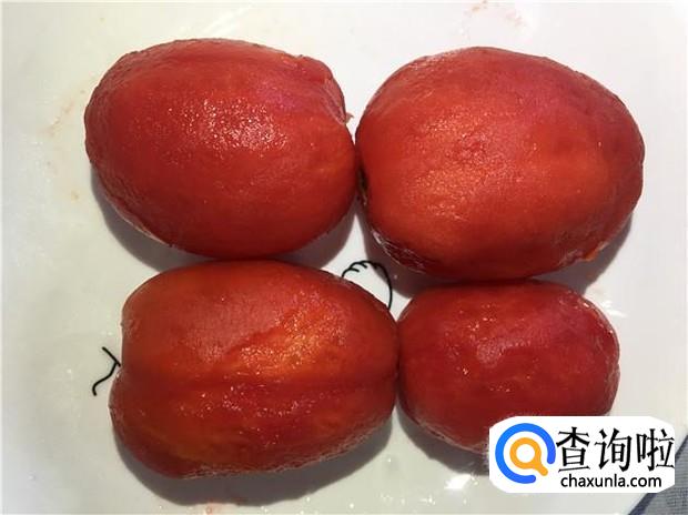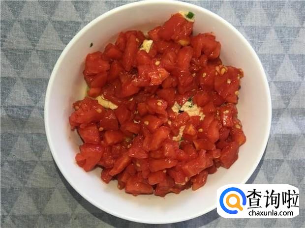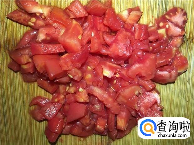 把番茄皮给剥下来,再把番茄切碎,备用。