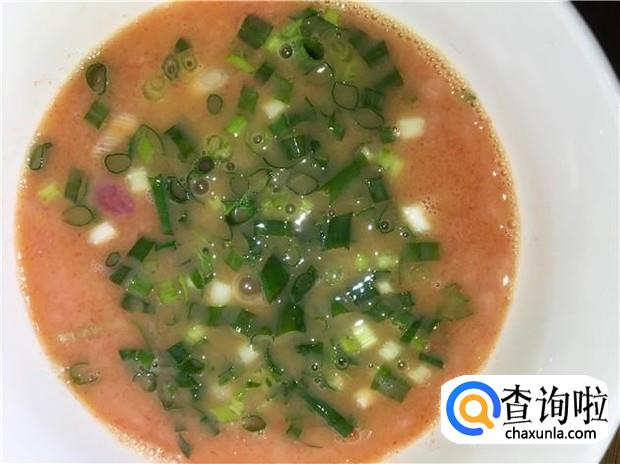 用一个漏斗,把番茄汁给压出来,然后再把番茄汁、葱末,一起倒入鸡蛋液中,搅拌均匀。