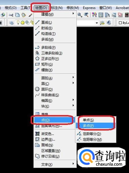 我们打开CAD软件来演示,如图所示,点击菜单栏“绘图”,选择“点”,我们看到,可以选“单点”,也可以选“多点”。