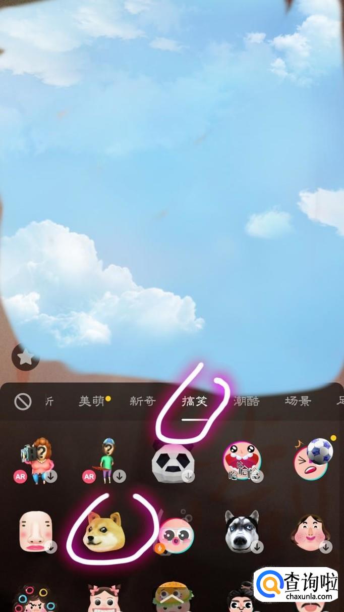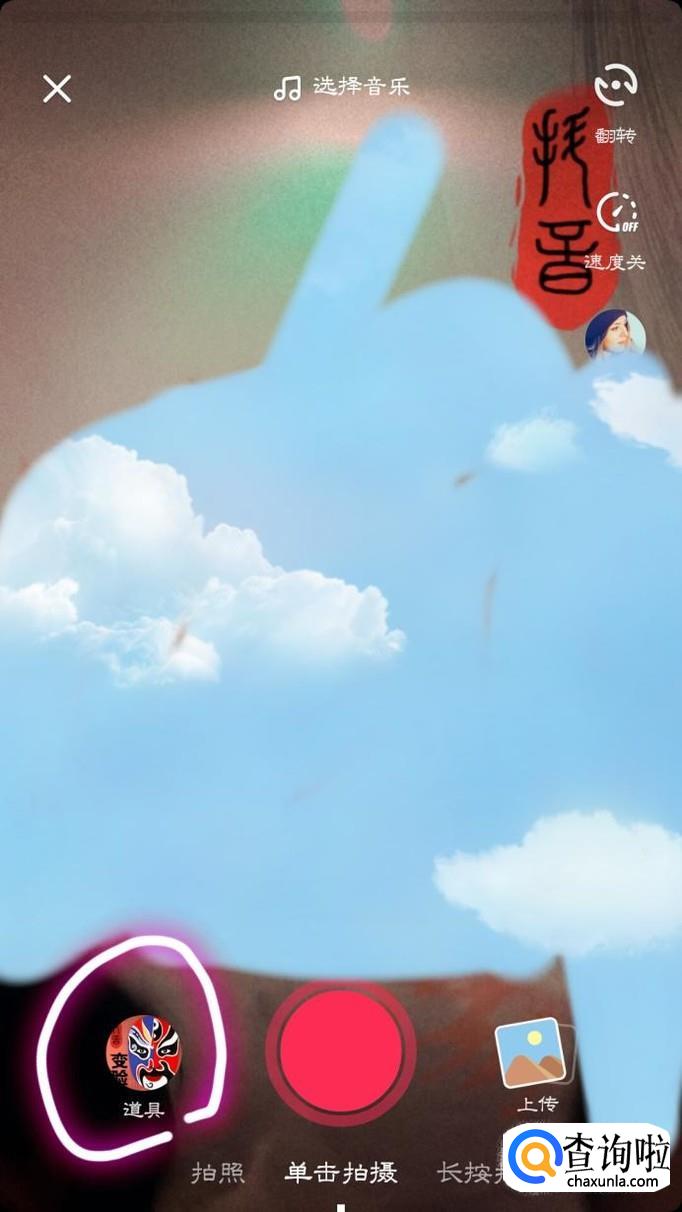 最后,我们完成上一步后,便会出现更多的道具,我们向右滑至“搞笑”下面有个“狗头”的标志我们点击录制,即可