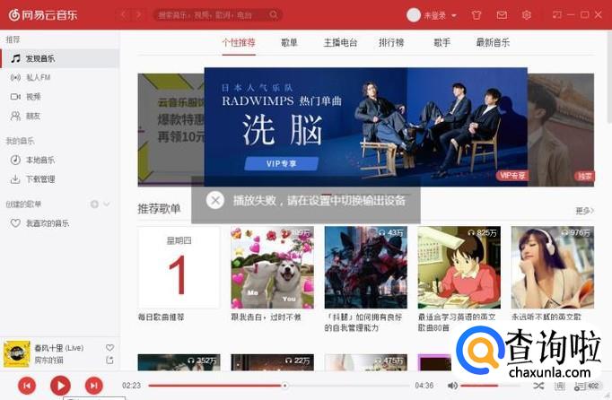 打开网易云音乐之后,可以看到音乐软件直接显示“播放失败,请在设备中切换输出设备”,这个时候我们可以知道我们的播放器两条连接线没有插对。我们再次检查一下。