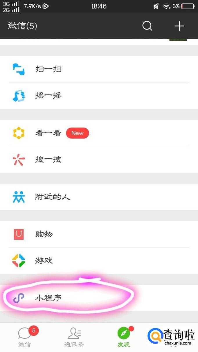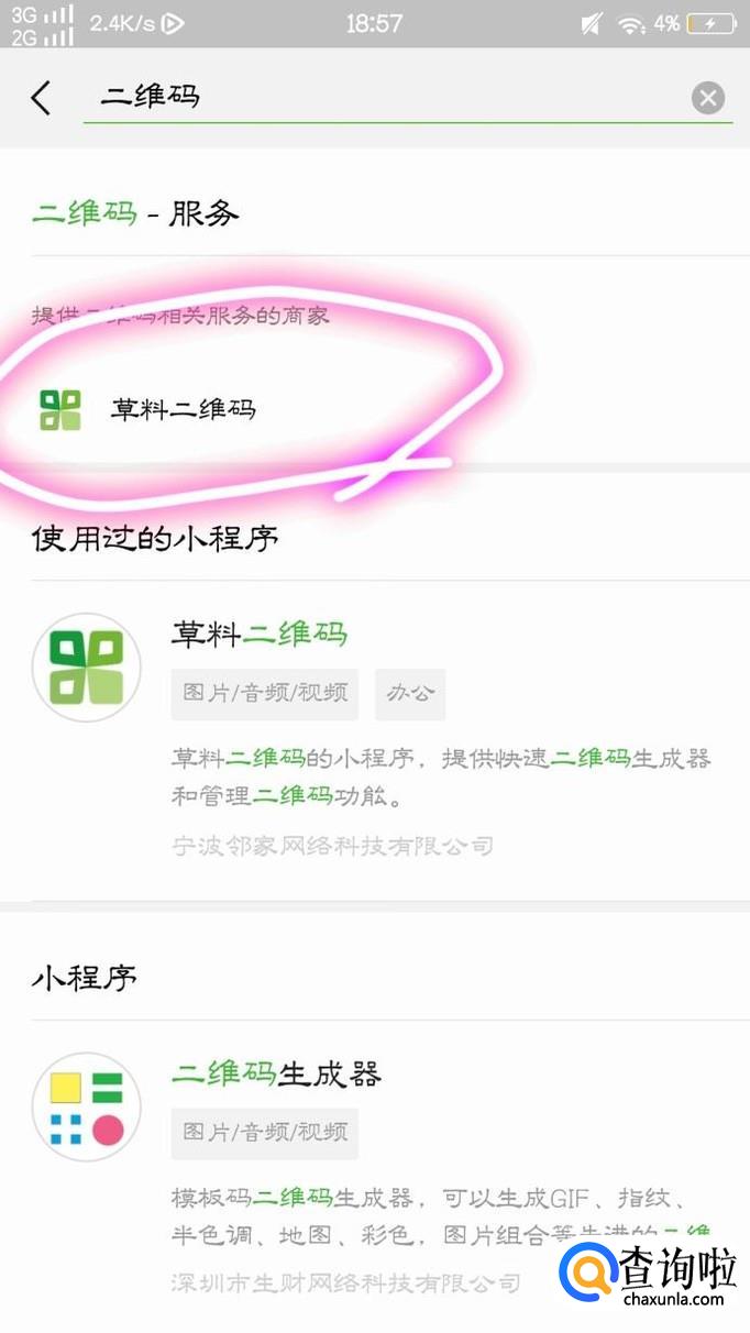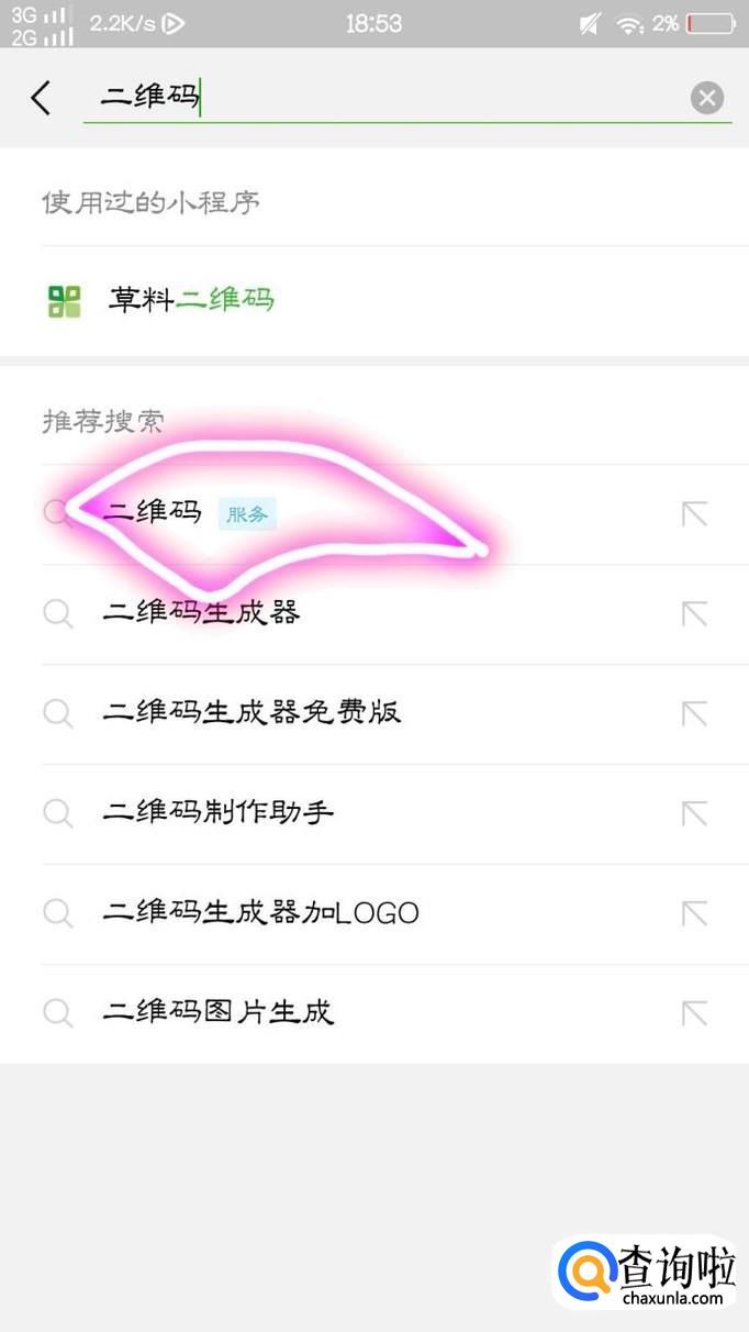 接下来,点击到“发现”这个页面,并滑至最下方,点击屏幕最下方的“小程序”点击完成以后,又再次点击屏幕右上方的查找符号,并查找“二维码”查找完毕后,点击二维码,并且右上方有“服务”标志的二维码
