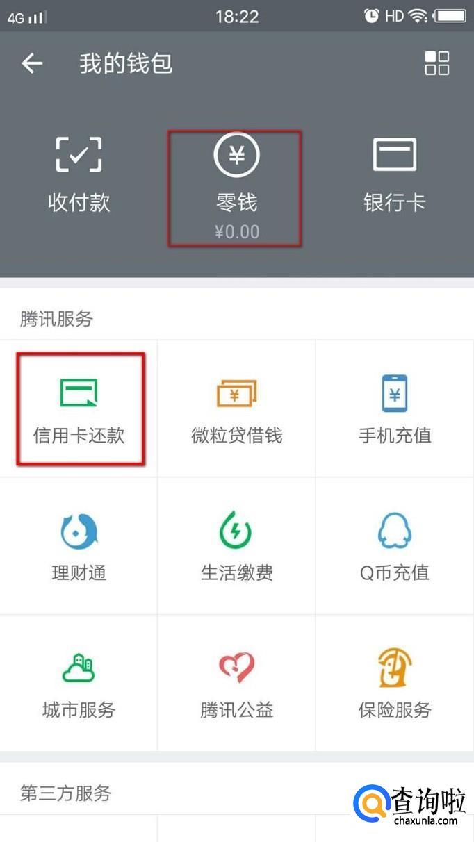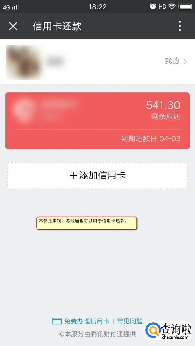 除了零钱外零钱通同样可以用于信用卡还款,我们还是回到微信“我”的页面,在该页面我们可以看到信用卡还款的字样,点击进去即可。此时我们可以看到绑定的信用卡。
