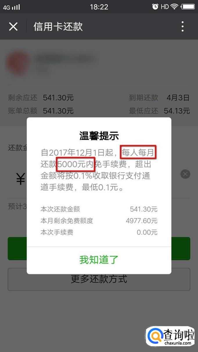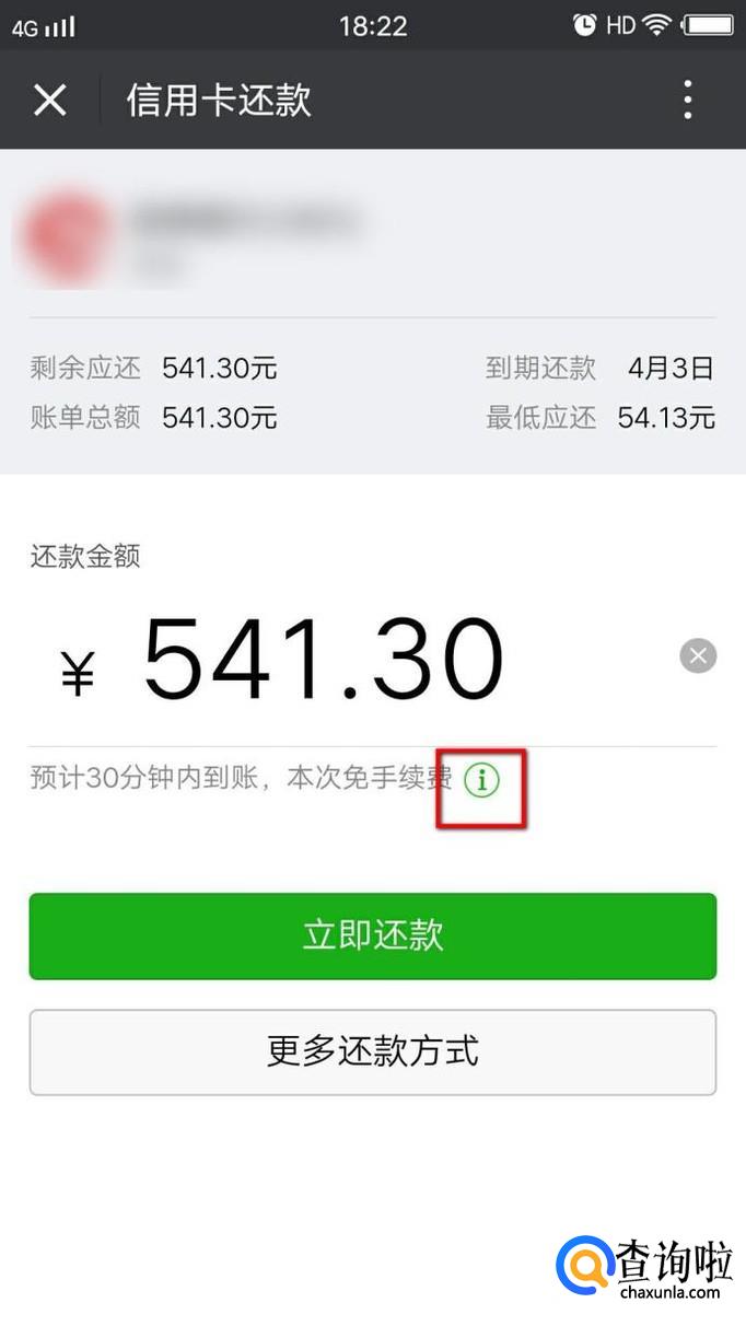 选择某一个信用卡进入到详细的还款页面,如下图所示。此时我们可以看到需要还款的金额,我们点击本次提现免费后面的图标,查看一下什么情况下可以提现免费。根据下图我们可以看到每个人每月仅有5000元免费还信用卡的额度,这些提醒大家花钱的时候不要大手大脚哦。