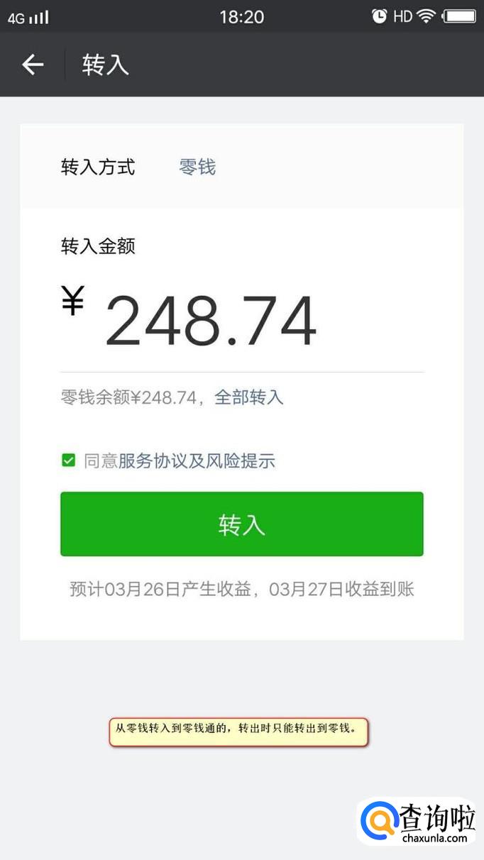 测评完成后我们回到转入到零钱通的页面,点击转入按钮,点击转入按钮,我们选择转入的方式和转入的金额,金额可以手动输入也可以点击全部转入,接下来我们点击“转入”按钮即可。