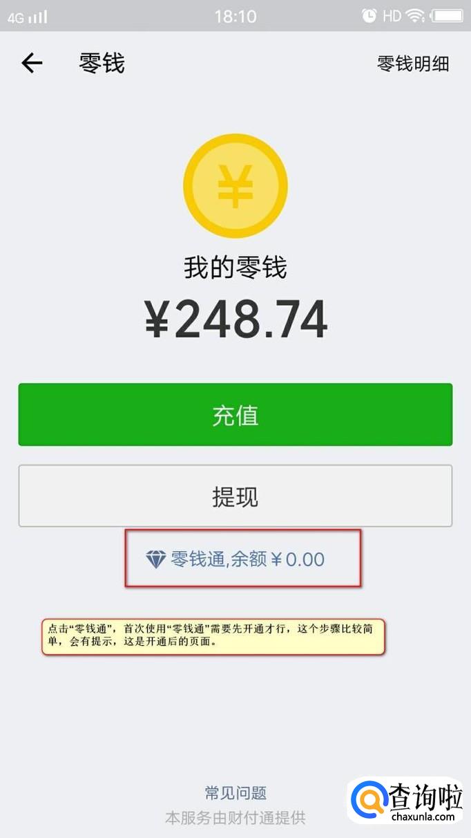 在我的钱包中可以看到零钱的字样,并且有你现在微信的余额信息。我们点击零钱图标进入到零钱的页面,在零钱页面的下方我们可以看到零钱通的字样,首次使用零钱通的话需要先开通才行,开通比较简单,我们跟着提示信息操作即可。