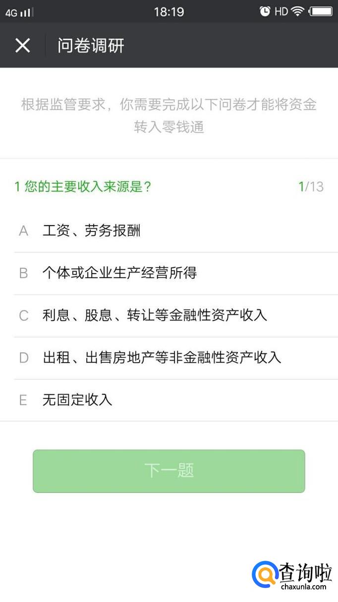 我们点击钻石旁边的零钱通字样,进入到零钱通的页面。在该页面我们点击转入按钮,如果是第一次转入到零钱通则必须要做一个投资的风险测试,这个测试按照你的真实情况选择即可,此处不再赘述。