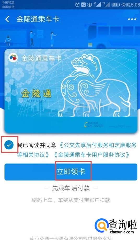 弹出的界面,我们点击图示中的勾选处,然后点击立即领卡;