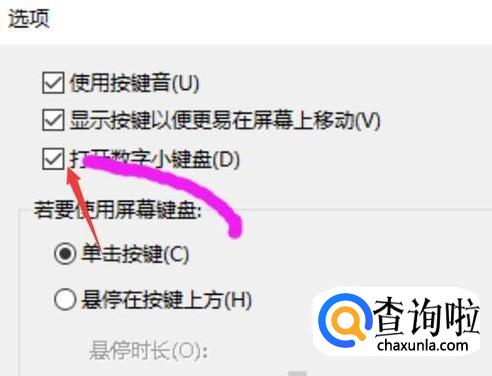选择打开数字键盘。然后在选项设置里将数字键盘选好,这时候就能开启数字键盘了,这样对以后的操作也会非常方便的。