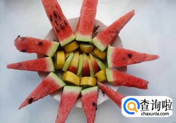 将香蕉段码放一圈后摆上西瓜,