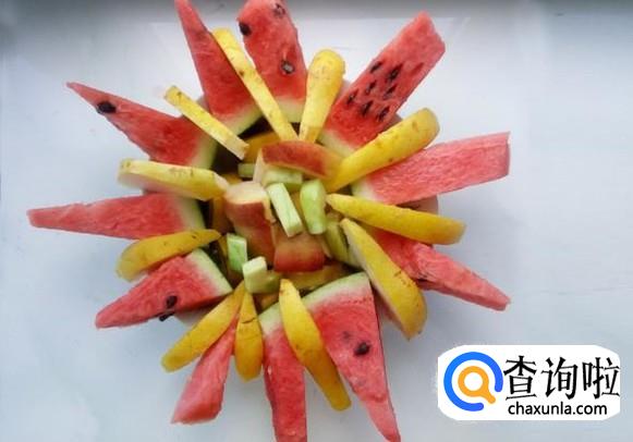 将鸭梨放入西瓜的缝隙中,然后再把剩余的水果切一些放入果盘的中间,漂亮的水果盘就做好了。
