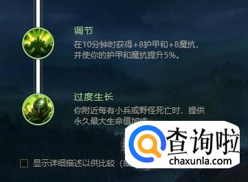 调节十分钟后为布隆提供高额双抗加成,过度生长为布隆提供生命值成长,提升后期坦度