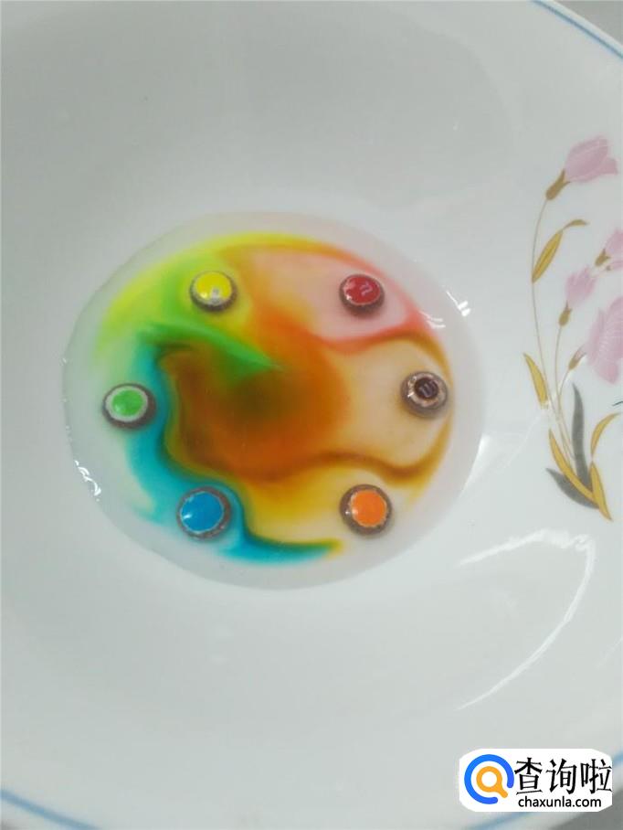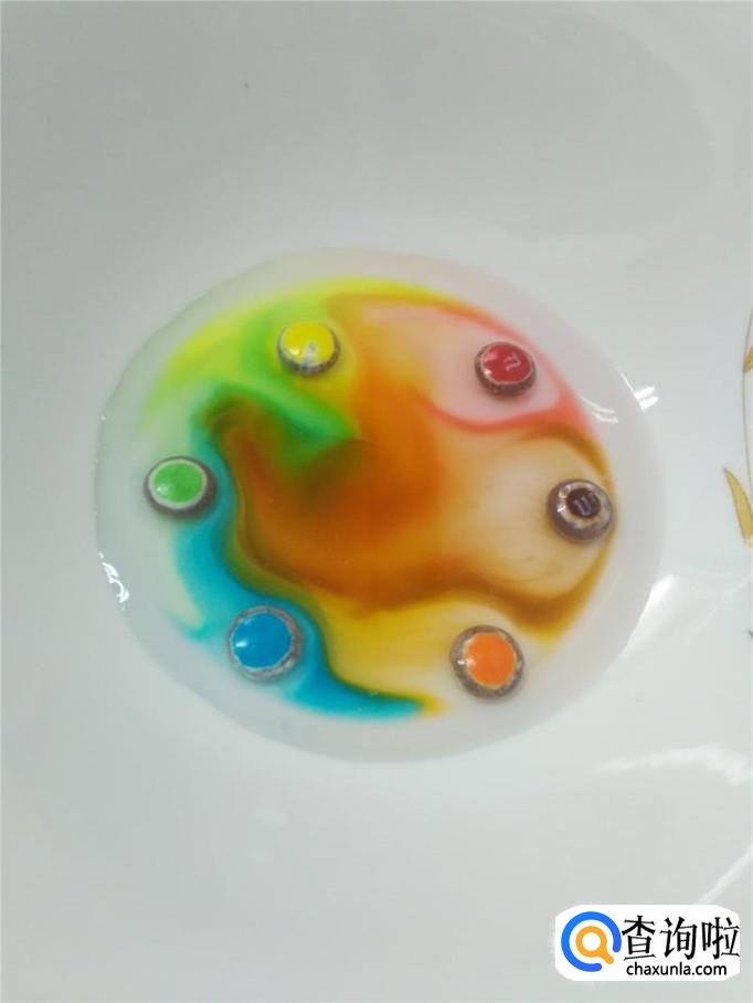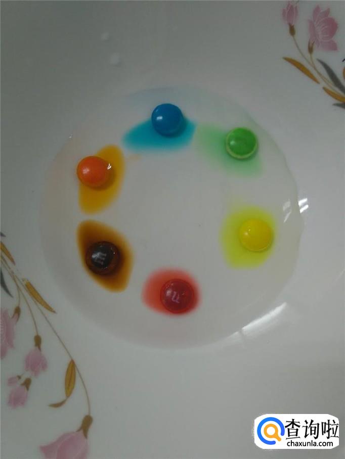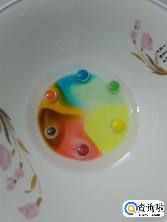 拿几个颜色不同的巧克力豆,分散地放进大碗中,刚放进去,颜色就开始溶解了。