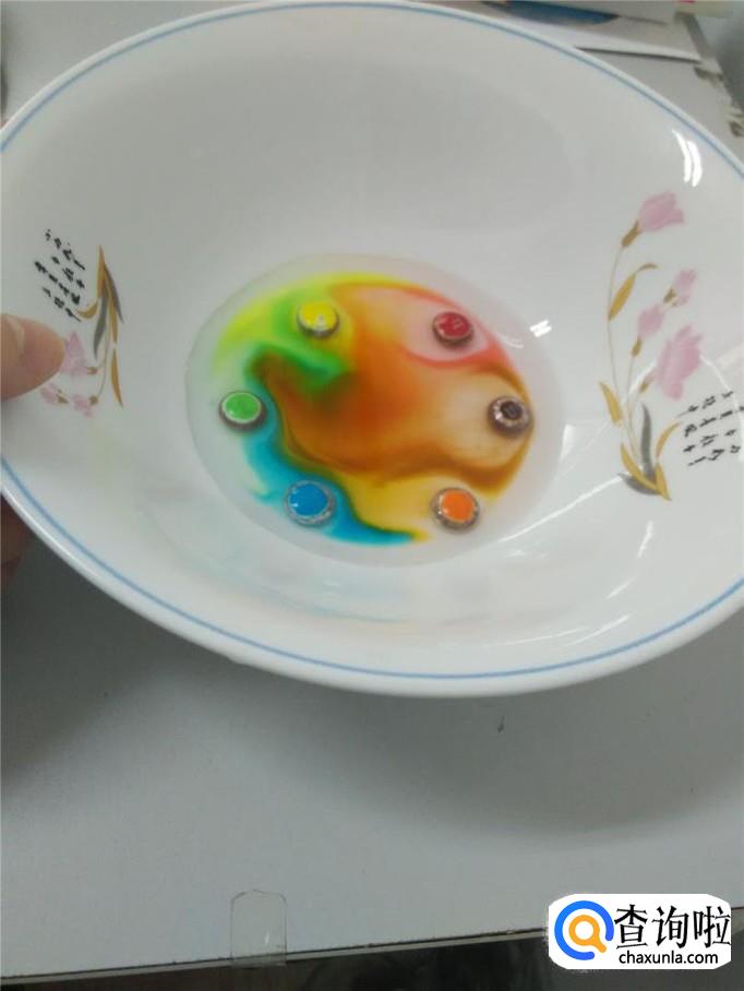 用手轻轻转动碗边,颜色开始不规则地混在一起,象彩虹一样漂亮。通过这个小实验,告诉孩子温水能使巧克力糖溶解,并且颜色也会混合在一起。