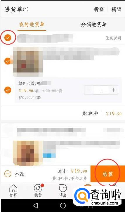 然后,点击下方从右边数的第二个“进货单”,在这里勾选要购买的东西,选择“结算”。