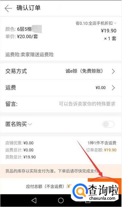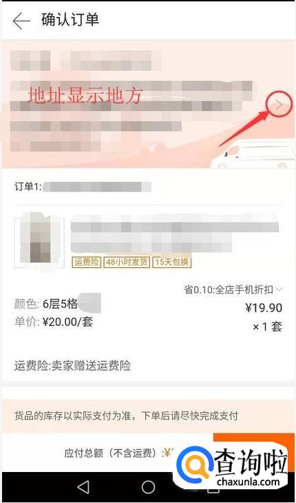 这个时候跳入到“确认订单”的界面,是让你查看地址,产品规格数量等等是不是对的,地址如果需要修改就选择后面的小箭头,我已经用红色的圈圈画出来了。