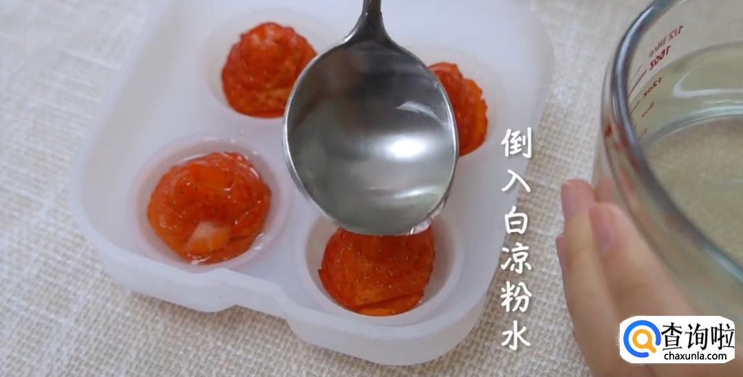 草莓切花,放入模具中,然后淋上白凉粉水。