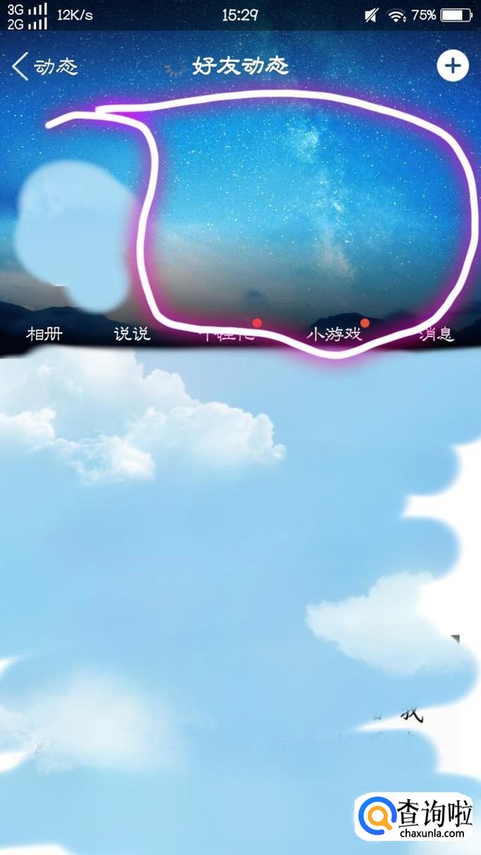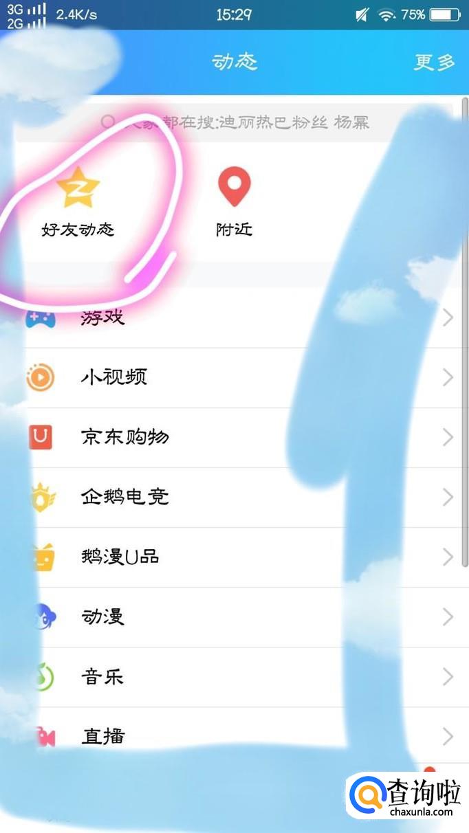 紧接着,大家将会看都自己的QQ好友的动态,我们点击屏幕上方的这个区域中的任何一个地方