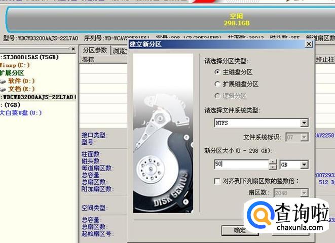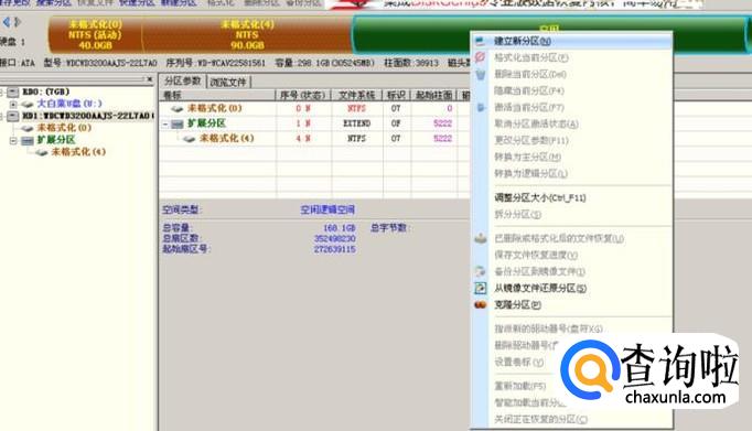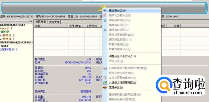 在DG的主界面左边会看到你的两个硬盘,下面的320G的是新硬盘。我们要把系统安装在新硬盘上,就在上面右键点击,在弹出的对话框中点“建立新分区”。