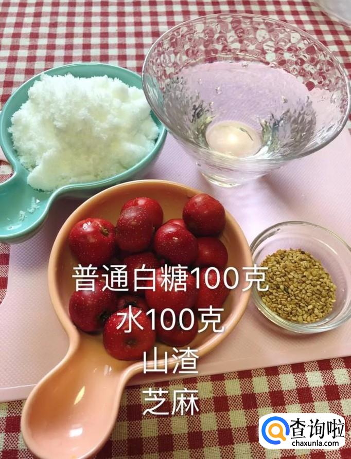 首先准备好所有要用到的食材,如下图所示。小贴士:普通白糖100克,水100克,山楂适量,芝麻适量。
