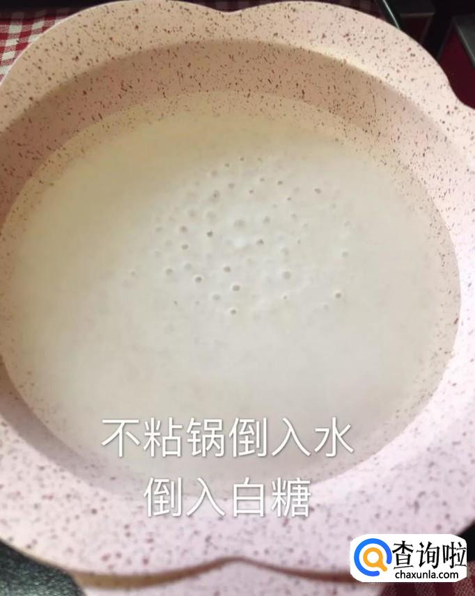 接着把水和白糖倒入不粘锅,开小火慢慢熬,如下图所示。