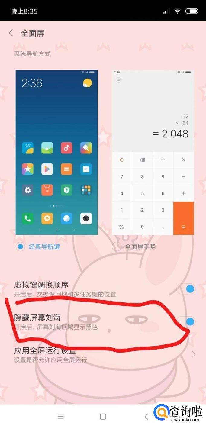 然后在全面屏设置里面,可以看到“隐藏屏幕刘海”这个选项,点击右侧开关,就可以顺利的把小米8的刘海屏给隐藏了。