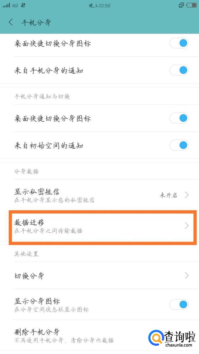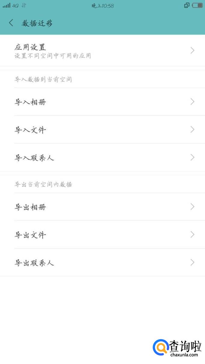 我们可以进入设置里面的手机分身来进行数据迁移,即把原始空间里面的数据迁移到分身空间里面,打开方式之前说过了就不赘述了,我们可以把相册,联系人,文件,应用等导过来,当然会占用等量的空间。