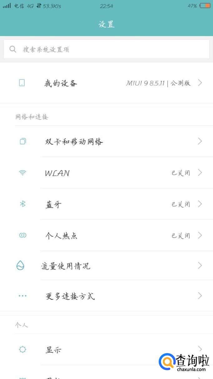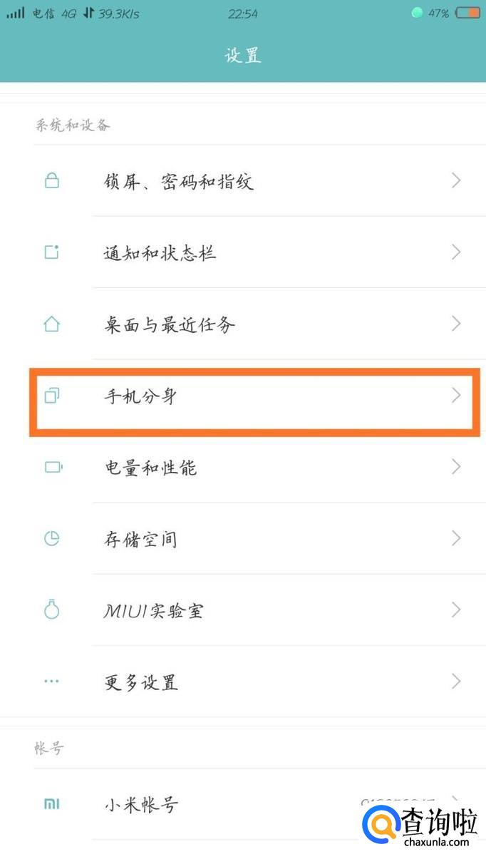 好了,现在来说MIUI手机分身的正确开启方式。首先打开系统设置,向下面拉一点,然后在"系统和设备"里面就能找到"手机分身"选项,就在电池选项的上方,点击打开。
