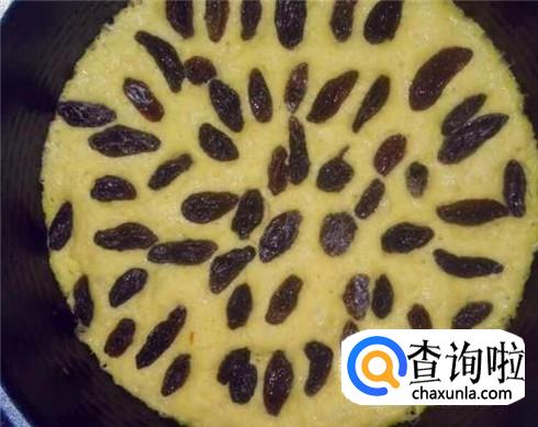 电饭锅通电,用勺子背面沾点水压平面糊表面,喜欢吃葡萄干或者枸杞子、核桃仁的,可以适当撒一些在上面,盖上盖子按下按键电饭锅就会自动工作,熟了之后也会提醒你的,将发糕倒出来切块就可以吃啦。