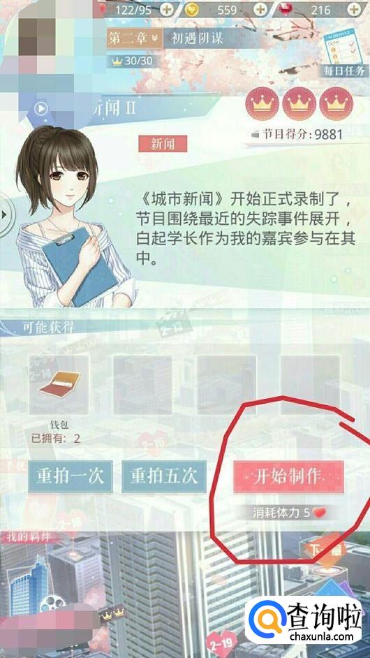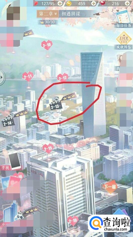 首先下载安装,并打开恋与制作人的 APP,点击【开始】在普通关卡中找到关卡2―13,并点击,如图