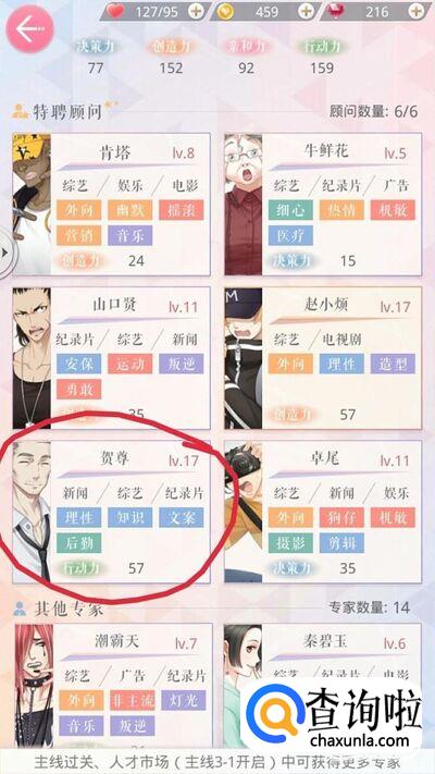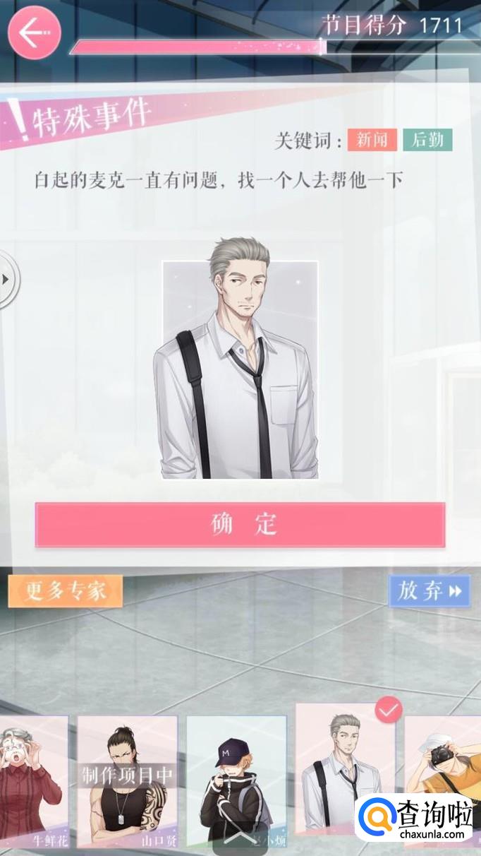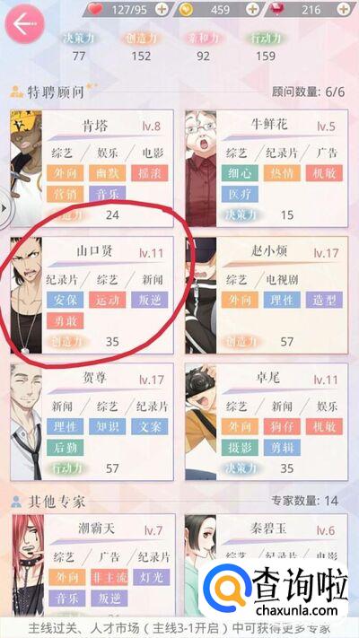 然后在跳出来的页面中根据关键词选择人物,关键词为:新闻、运动。我们来查看一下专家人物的属性和关键词,发现山口贤十分符合,点击确认,如图