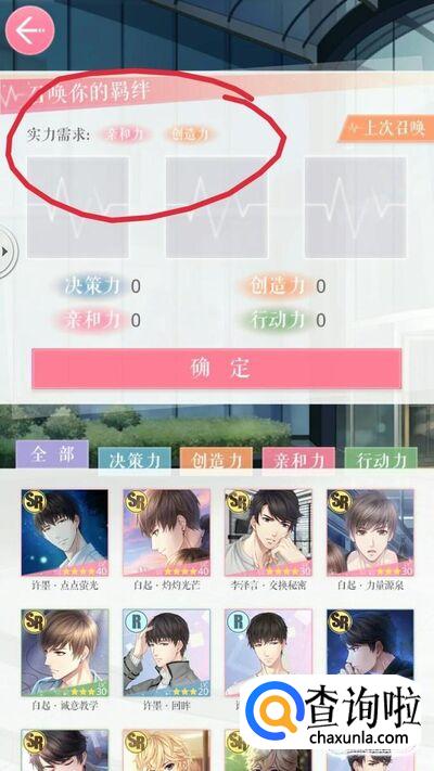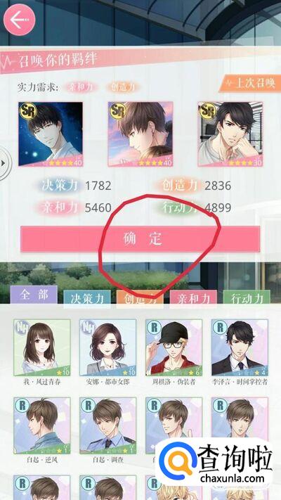 然后进行羁绊召唤,点击【羁绊召唤】,根据提示寻找羁绊,提示需要提高亲和力和创造力,推荐使用 许墨(点点荧光),周棋洛的伪装者,还有周棋洛的独家定制,如果没有这几张羁绊的话,就提高你有的羁绊的星级和等级,如果星级和等级够高的话,不管使用哪几张羁绊都可以过的,最后选择好羁绊,点击确定就可以通过啦,如图