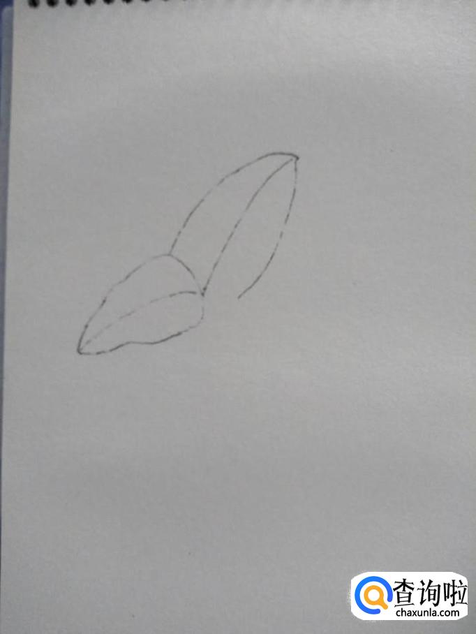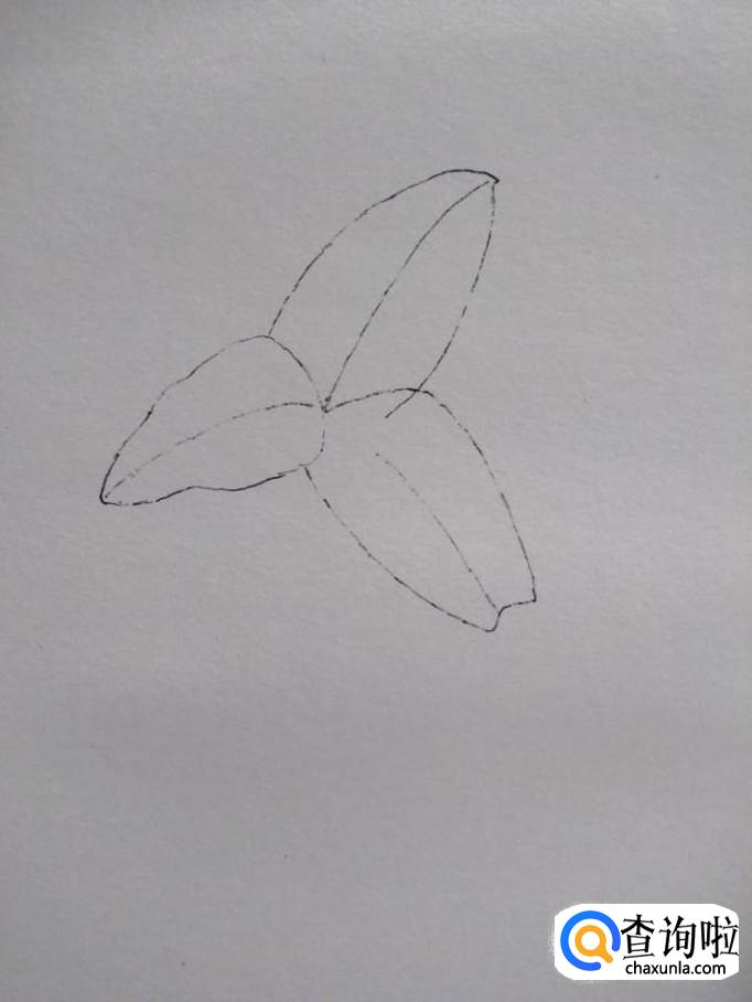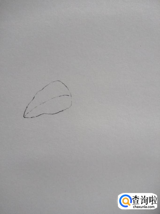 先画一瓣花瓣,如下图所示,画成略像三角形的形状,在花瓣中间画一根线相连接。
