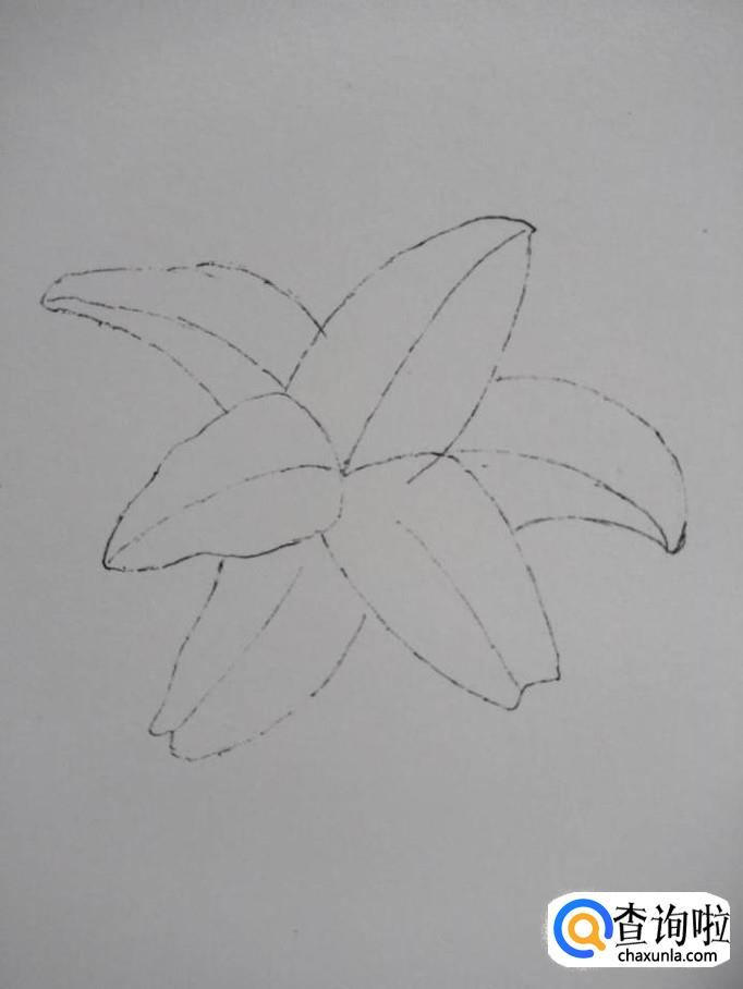 在之前画好的三瓣花瓣的空隙处再画三瓣花瓣,要比之前的花瓣大一点。在花瓣相连的中心画上花蕊。