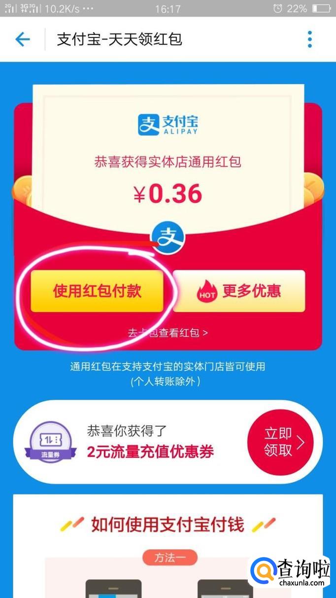 领取到红包以后,可以查看红包的金额,如果马上使用红包,则点击使用红包付款