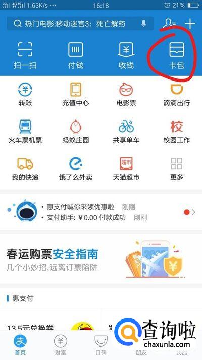 如果不马上使用红包,则退出,可以在右上角的卡包中查看自己领取的红包