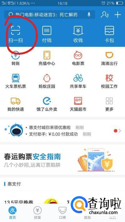 进入支付宝首页,点击左上方的扫一扫,然后扫取别人的发红包的二维码就可以领取红包