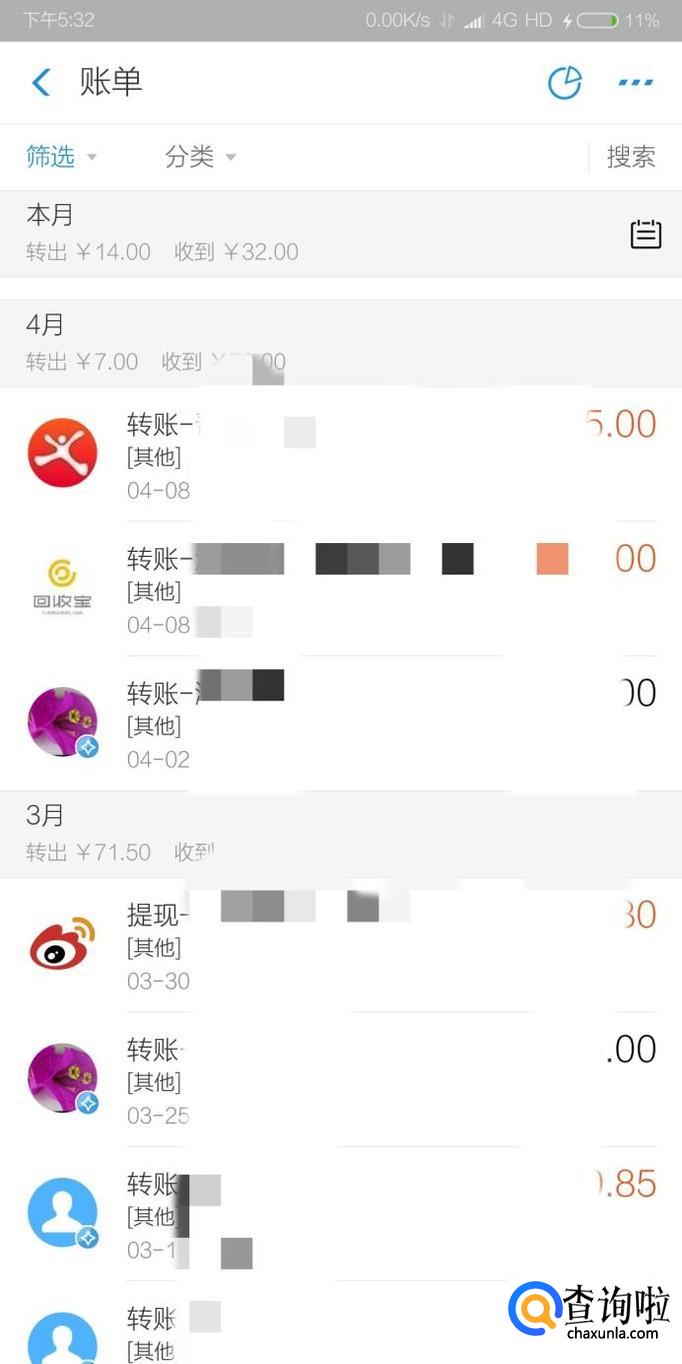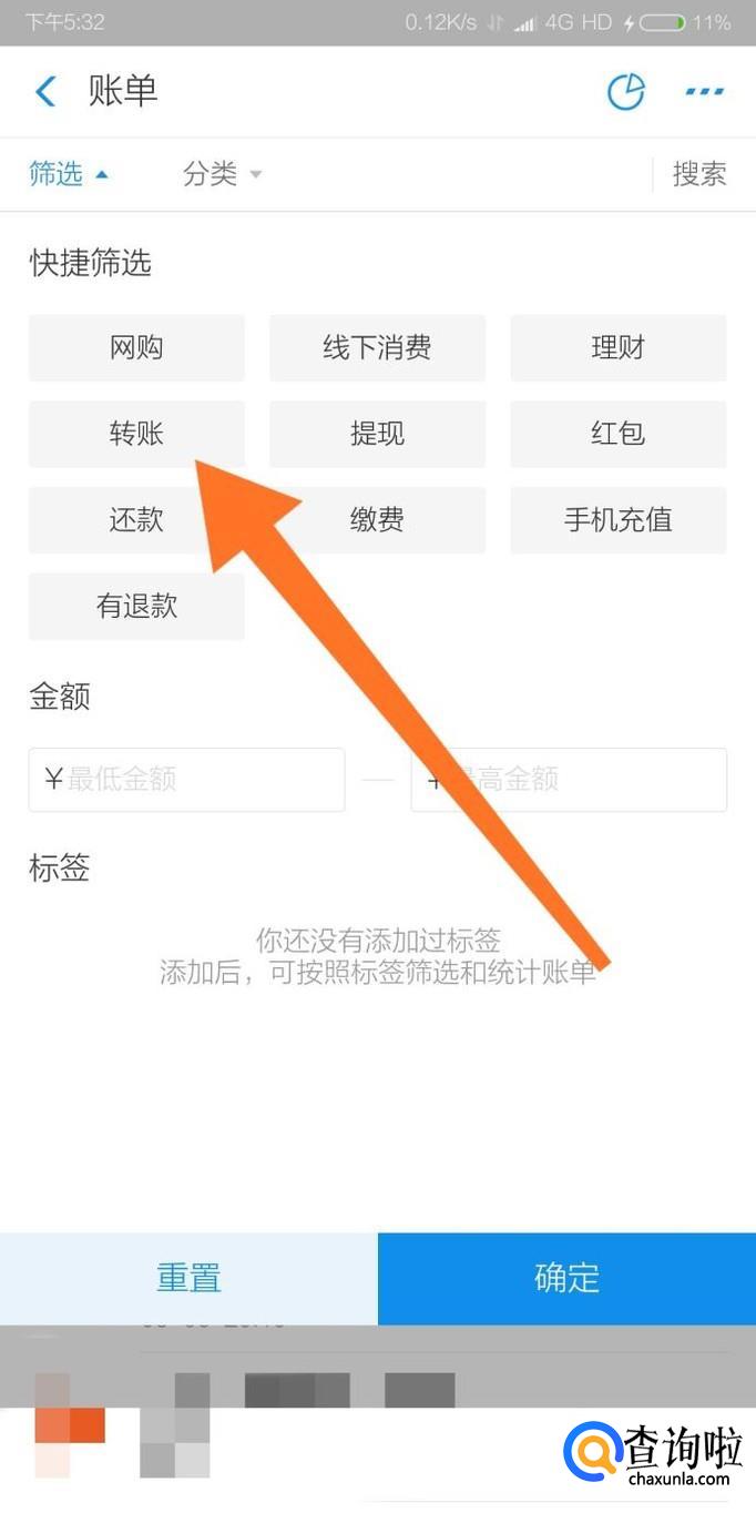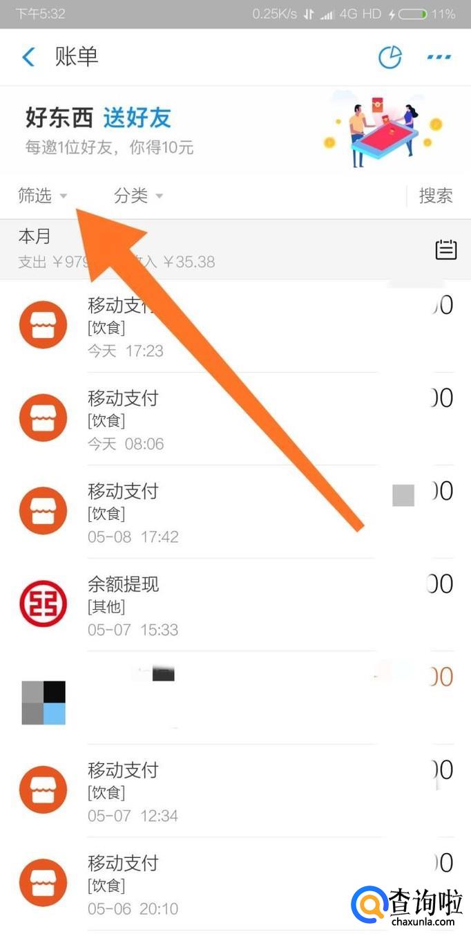 进入账单页面后,接着点击屏幕左上角的“筛选”。