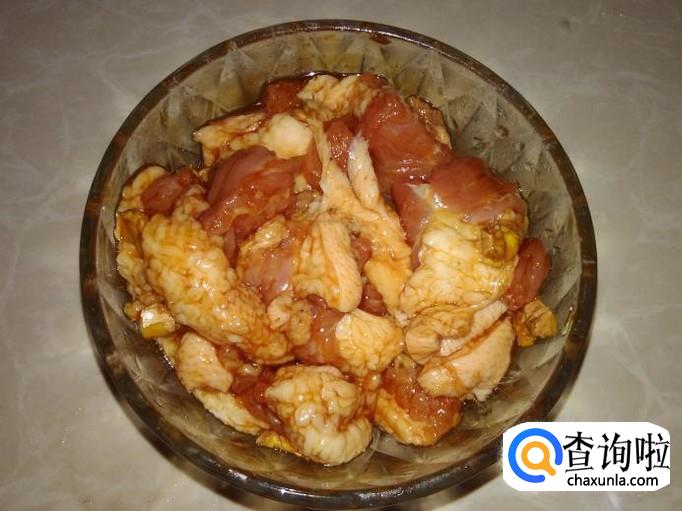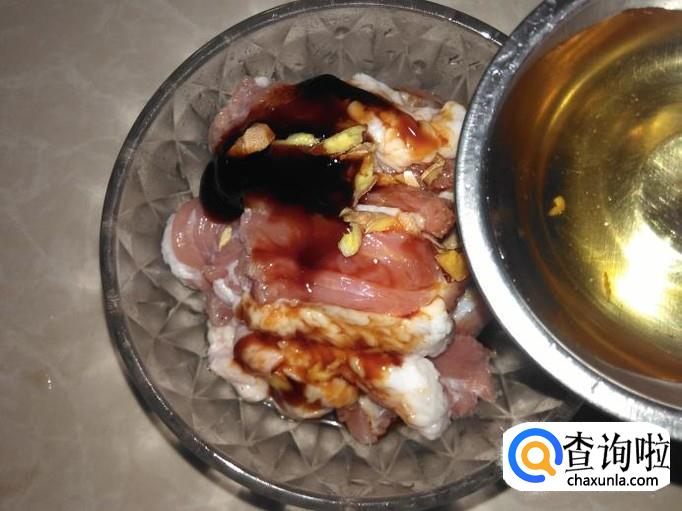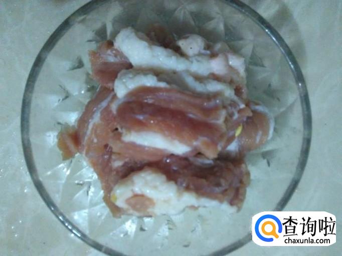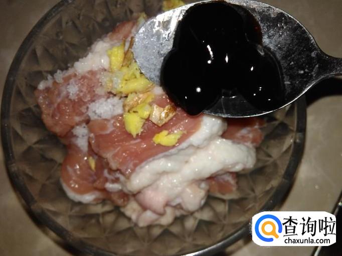 猪肉切成片,加适量的盐、姜蓉、耗油。