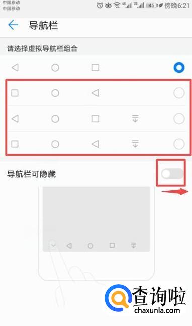 弹出的界面,我们就可以设置了,我们可以选择另外三种方向的其中一个,我们点击选择按钮就可以选择了,我们想要隐藏导航栏的话,我们将开关向右滑动就可以隐藏导航栏了。