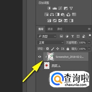 接下来,我们用快捷键快速创建剪切蒙版。左手按住ALT键;右手控制鼠标,移到两个图层相接的位置上。这时,会看到有一个向下箭头的。然后,鼠标点击一下,立即创建了剪切蒙版。