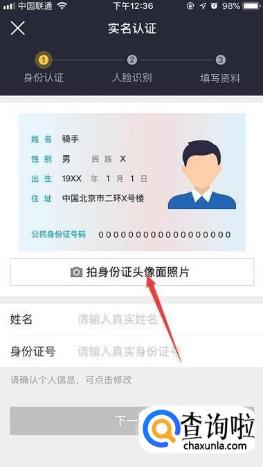 进入实名认证页面,按照要求填写好身份证的个人信息,然后点击“下一步”,根据系统提示完成身份验证。