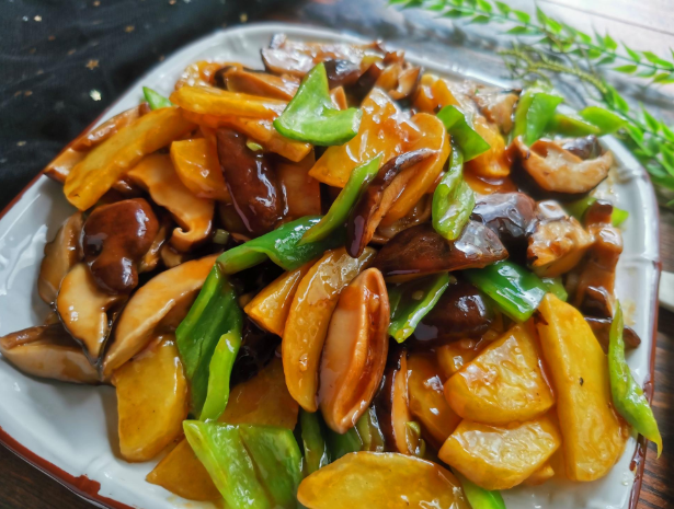 所需材料:土豆2个、香菇250克、尖椒2个、油盐适量、葱1段、姜2片、大蒜2瓣、生抽1汤匙、水淀粉适量、