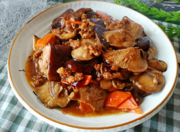 所需材料:鲜香菇500克、猪肉150克、胡萝卜1段、油盐适量、葱1段、姜1片、大蒜2瓣、料酒1汤匙、生抽1汤匙、蚝油1汤匙、香油12汤匙、水淀粉适量。