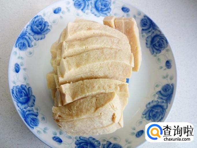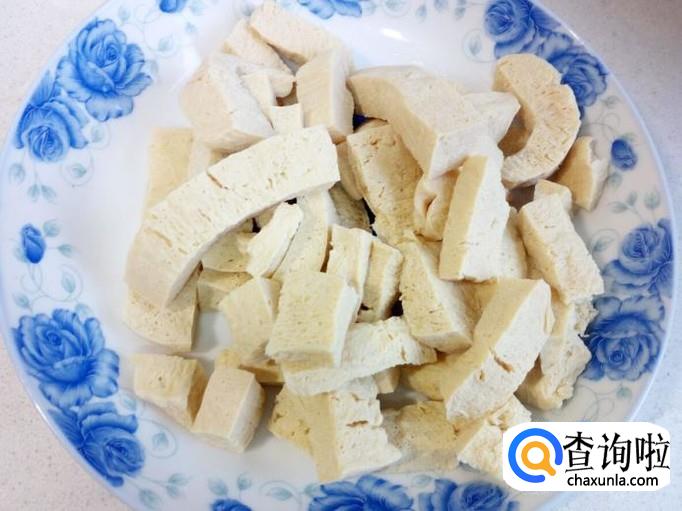 从冰箱取出冻豆腐自然解冻一会(我这冻豆腐,不是市场买的,是自己把豆腐放入冰箱冷冻的,切得块有点细长)。