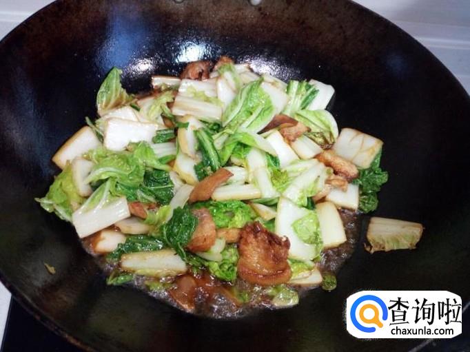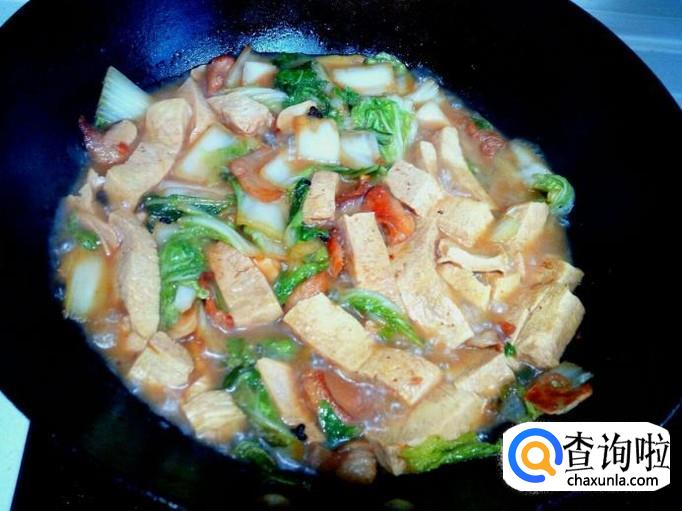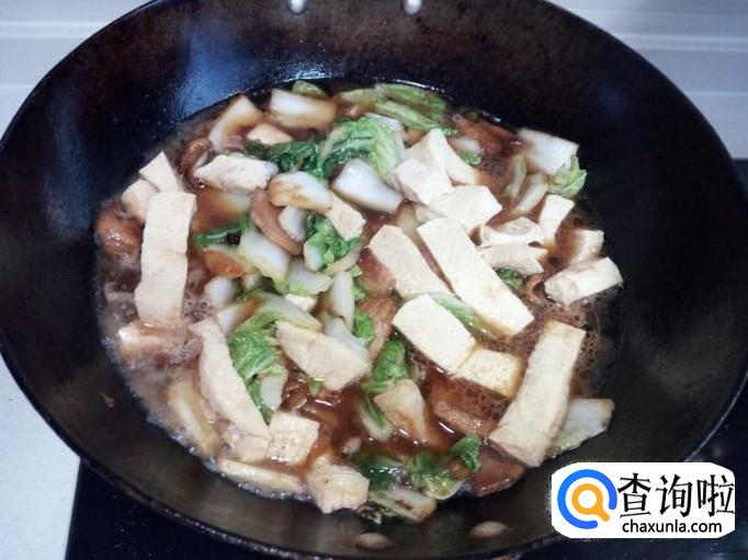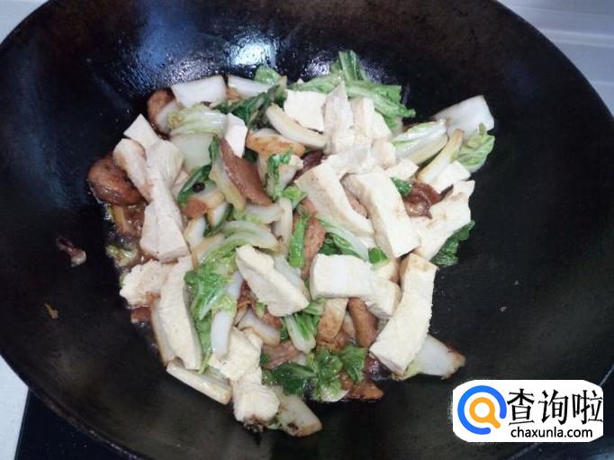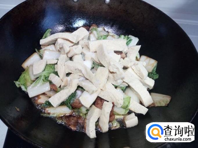 炒至大白菜没有水气后,放入冻豆腐。
