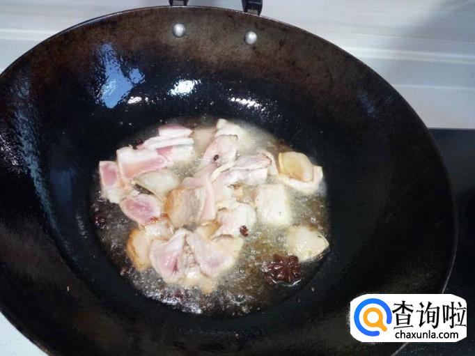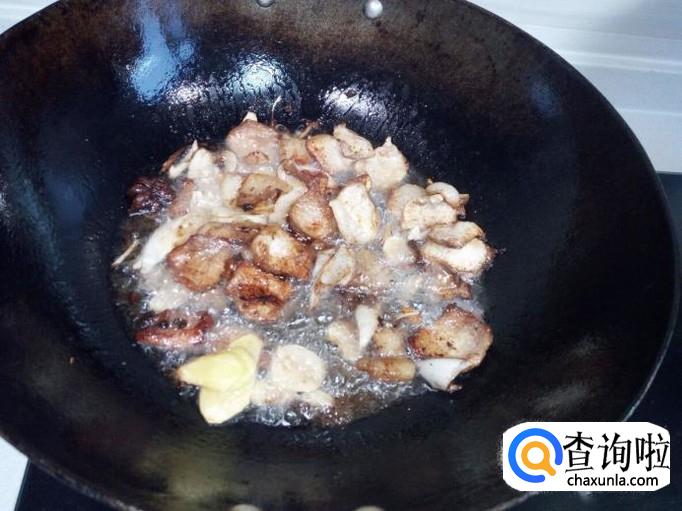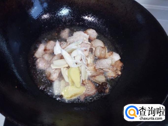 多炒一会让肉下些猪油,然后放入葱,姜,蒜翻炒,放入料酒,酱油。