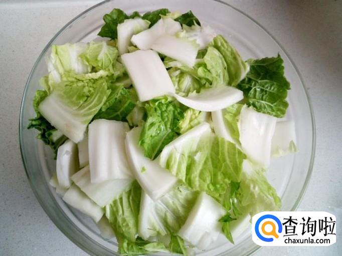 大白菜用水清洗干净,控干水分,切成块。